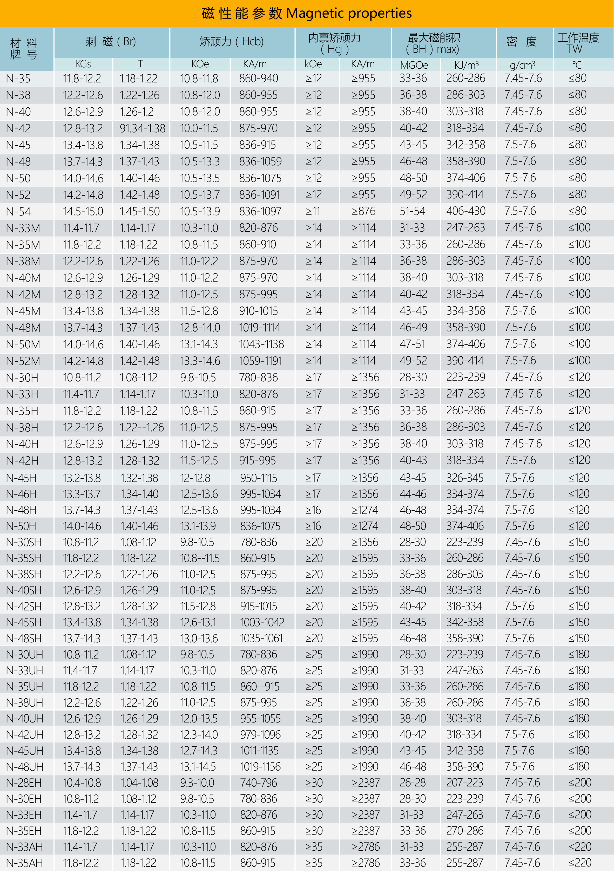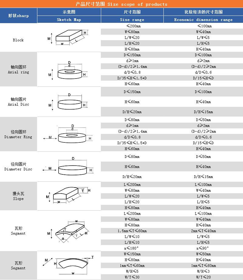 磁性能極高。它的(BH)max值是鐵氧體磁鐵的5-12倍,是鋁鎳鉆鐵的3-10倍;它的矯顧力相當于鐵氧體磁鐵的5-10倍,鋁鎳鈷磁鐵的5-15倍,其潛在的磁性能極高,能吸起相當于自身重量640倍的重物。